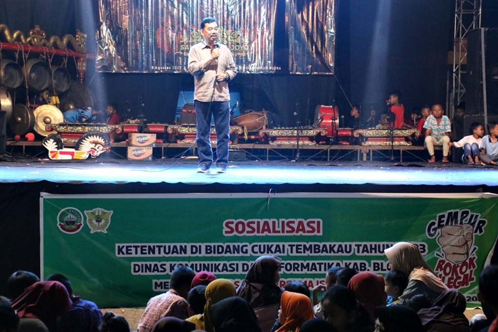 Sosialisasi digelar Dinas Komunikasi dan Informatika (Dinkominfo) Kabupaten Blora bekerja sama dengan Kantor Pengawasan Pelayanan Bea dan Cukai (KPPBC) Tipe Madya Kudus di halaman pasar rakyat Sido Makmur Blora, Rabu (9/8/2023) malam.