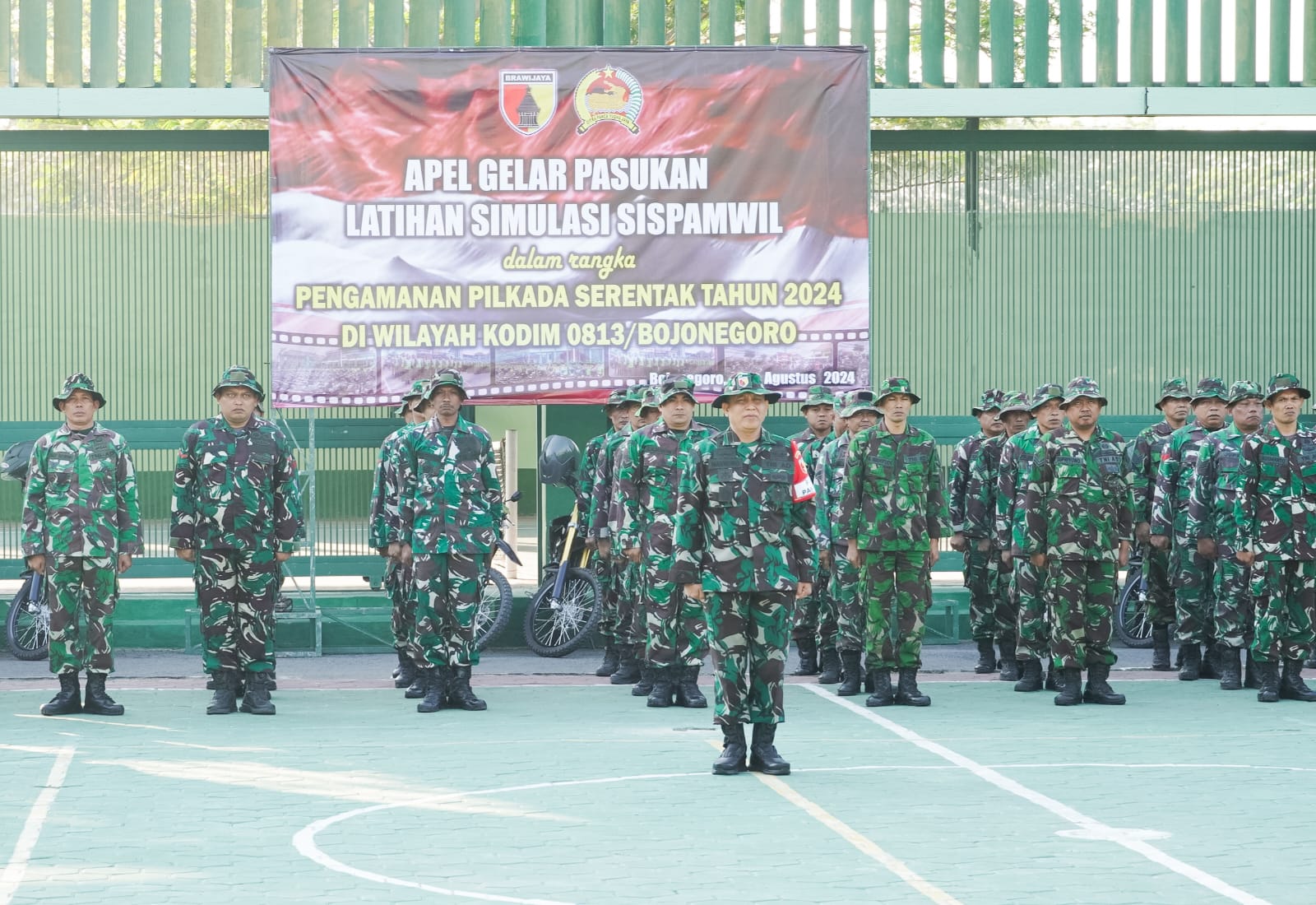 BOJONEGORO, dutaperistiwa.com – Sebagai kesiapan menyambut pelaksanaan Pemilihan Kepala Daerah (Pilkada) Serentak tahun 2024 mendatang, Komando Distrik Militer (Kodim) 0813 Bojonegoro menggelar Apel Gelar Pasukan dan Simulasi Latihan Sistem Pengamanan Wilayah (Sispamwil) dilapangan Markas Kodim setempat, Jum’at (16/08/2024).
