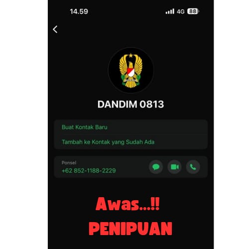 BOJONEGORO, dutaperistiwa.com – Hati – hati ! Beredar sebuah akun WhatsApp palsu dengan nomor Hand Phone dan foto profile yang mengatasnamakan Komandan Kodim 0813 Bojonegoro.