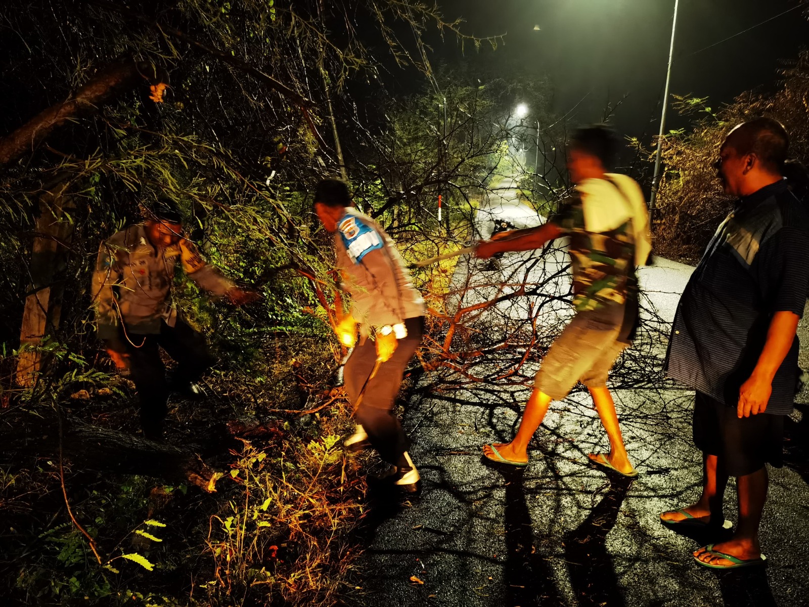 Personel Polsek Malo segera turun ke lokasi untuk mengevakuasi pohon tumbang bersama warga setempat. Mereka bekerja sama memotong batang pohon yang melintang di jalan menggunakan alat seperti gergaji, sabit agar arus lalu lintas dapat kembali normal.