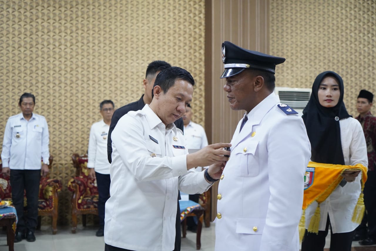 PRINGSEWU, dutaperistiwa.com – Penjabat (Pj) Bupati Pringsewu Marindo Kurniawan melantik dan mengambil sumpah Sopyan sebagai Pj Kepala Pekon Bumirejo, Kecamatan Pagelaran, Kabupaten Pringsewu. Sopyan menggantikan Misno, kepala pekon sebelumnya yang meninggal dunia beberapa waktu lalu. Prosesi pelantikan yang dihadiri anggota DPRD Kabupaten Pringsewu Anton Subagyo, jajaran pemerintah daerah dan forkopimda serta camat setempat berlangsung di Aula Utama Pemkab Pringsewu, Rabu (09/10/2024).