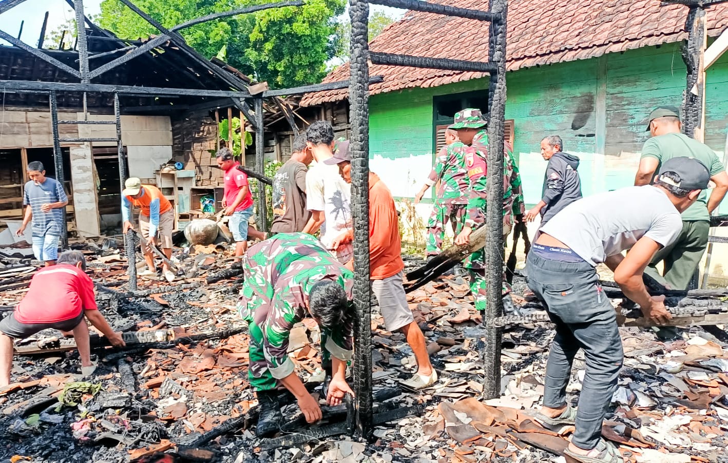 Puing-puing sisa rumah terbakar itu tampak berserakan, dan dibersihkan oleh anggota Babinsa Koramil 0813-24/Temayang bersama perangkat Desa Kedungsari dan warga masyarakat sekitar.