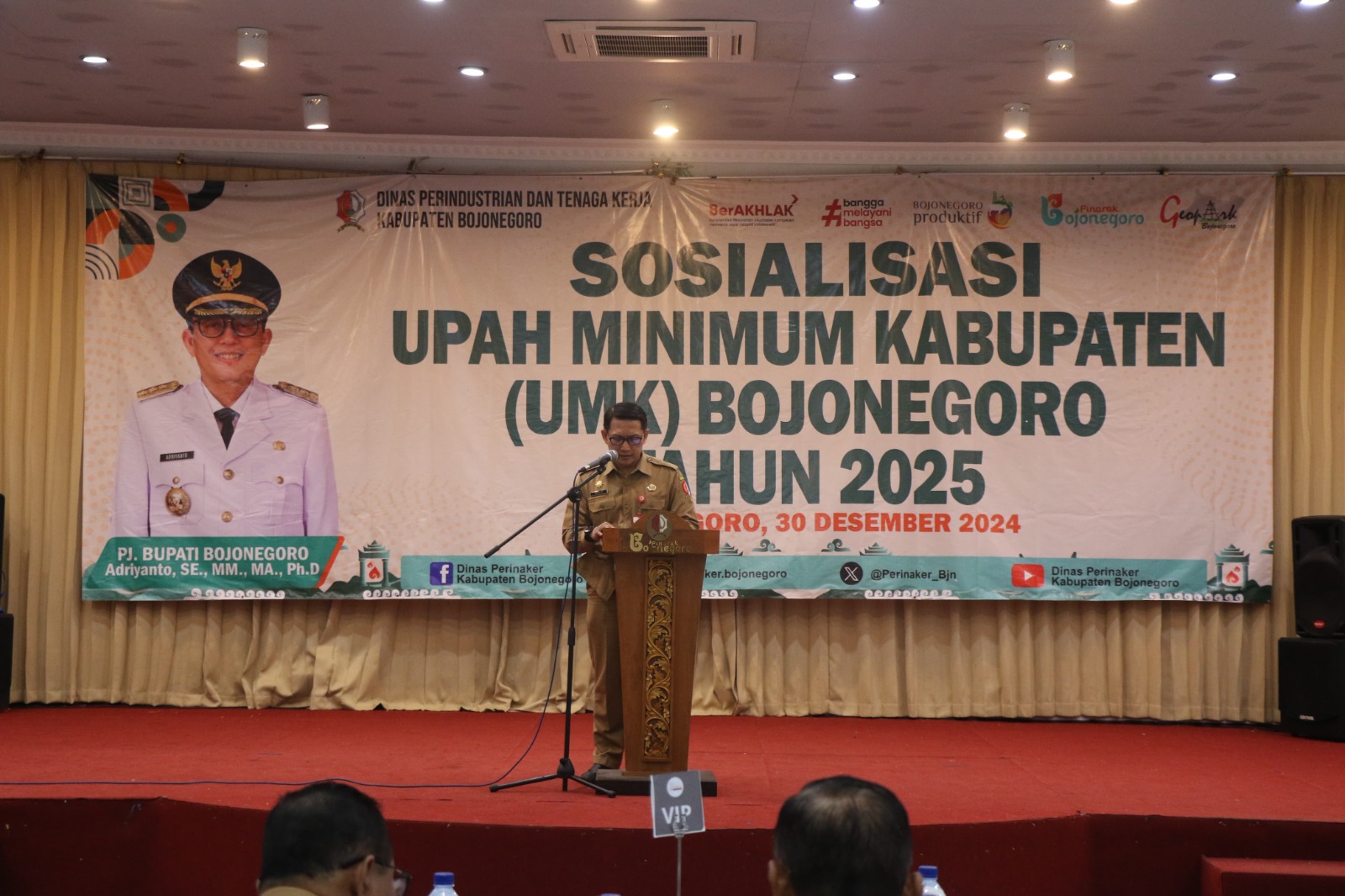 Pemerintah Kabupaten (Pemkab) Bojonegoro melalui Dinas Perindustrian dan Tenaga Kerja, mengumumkan sekaligus mensosialisasikan besaran UMK Kabupaten Bojonegoro Tahun 2025 yang telah ditetapakan oleh keputusan Pj Gubernur Jawa Timur bertempat di Aula Adelia Cafe.