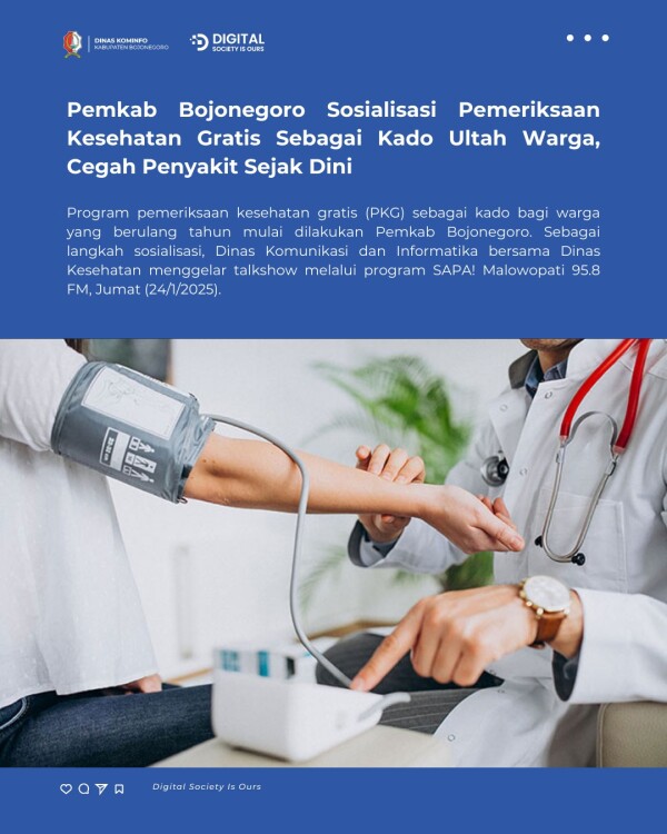 Kepala Dinas Kesehatan Kabupaten Bojonegoro Ani Pujiningrum menjelaskan, program pemeriksaan kesehatan gratis yang bertepatan dengan hari ulang tahun ini sebagai upaya untuk menjaga kesehatan dan mempopulerkan slogan lebih baik pencegahan daripada pengobatan. PKG dimulai 3 Februari 2025. “Sebab upaya ke depan, bagaimana penyakit terdeteksi sedini mungkin untuk kemudian ada solusi,” terangnya.