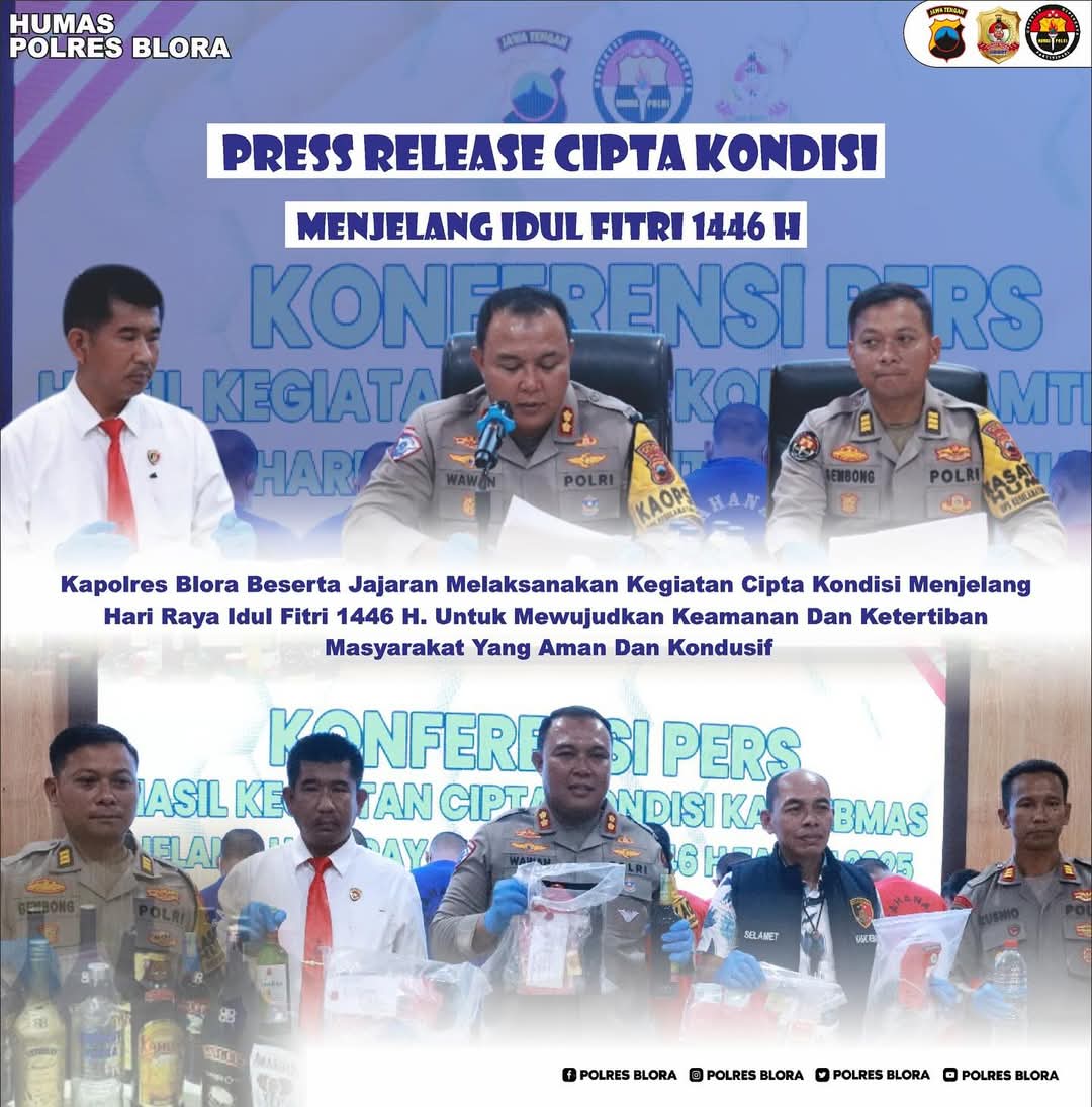 Kegiatan Konferensi Pers dan Press Release yang dilaksanakan di Aula Aryaguna pada hari Jum’at (21/2/2025), yang dihadiri oleh Kapolres Blora, Kasihumas Polres Blora, Kasat Reskrim dan Kasat Narkoba, Awak Media Kabupaten Blora tersebut, Kapolres Blora memaparkan beberapa hasil Operasi Cipta Kondisi.