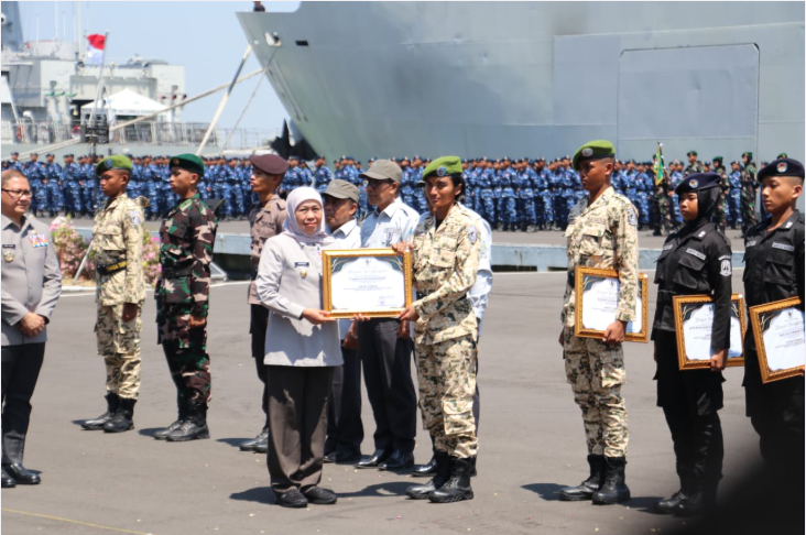 SURABAYA, dutaperistiwa.com – 16 Oktober 2025, Pada kegiatan Upacara Pembaretan 1.346 siswa SMAN Taruna se-Jawa Timur yang digelar di Dermaga Koarmada II TNI Angkatan Laut Surabaya, SMAN 2 Taruna Pamong Praja Jawa Timur Bojonegoro berhasil menorehkan prestasi membanggakan dengan meraih tiga penghargaan sekaligus dari Gubernur Jawa Timur.