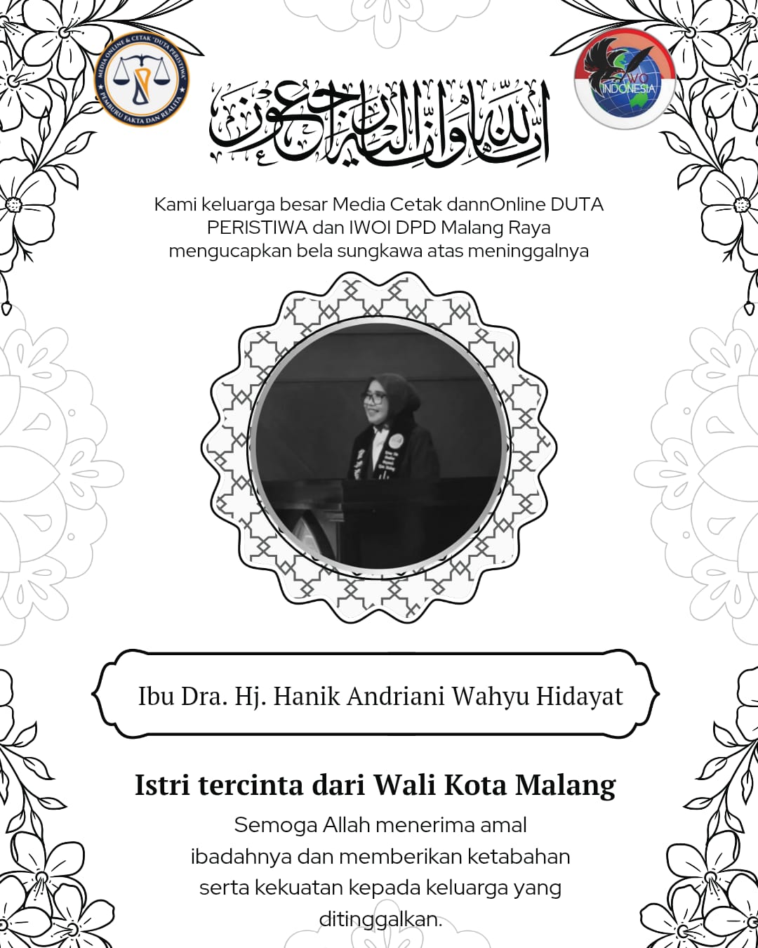 Sebagai bentuk empati dan solidaritas, Keluarga Besar Media Online & Cetak DUTA PERISTIWA bersama Ikatan Wartawan Online Indonesia (IWOI) DPD Malang Raya menyampaikan ucapan belasungkawa yang sedalam-dalamnya kepada keluarga besar almarhumah.
