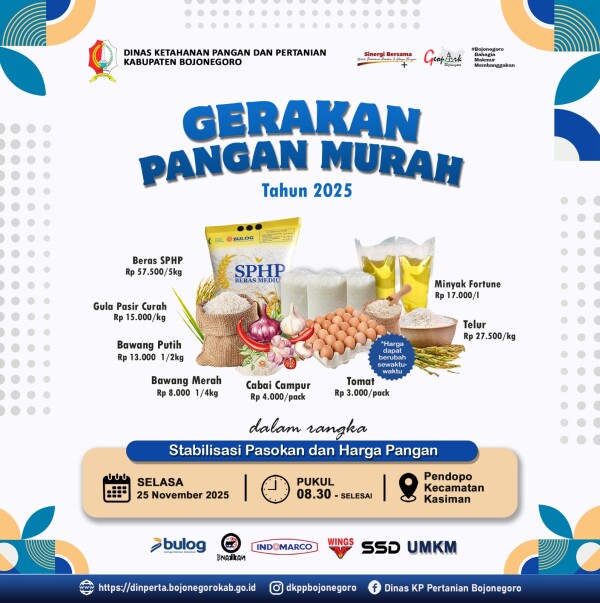 BOJONEGORO, dutaperistiwa.com – Dinas Ketahanan Pangan dan Pertanian (DKPP) Kabupaten Bojonegoro akan kembali menggelar Gerakan Pangan Murah (GPM) pada Selasa (25/11/2025). Kegiatan ini merupakan wujud sinergi pemerintah daerah dalam upaya stabilisasi pasokan dan harga pangan bagi masyarakat Bojonegoro.