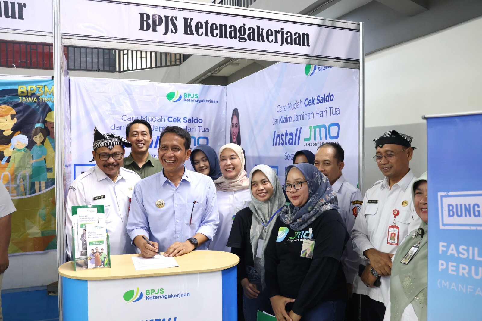 Juga penyerahan sertifikat merek IKM ‘Rimambat’, produk batik Dolokgede, Kecamatan Tambakrejo; serta ‘Silvanara’ produk tepung olahan Desa Solorejo, Kecamatan Padangan; produk kerupuk ikan dan rempeyek dan pangsit Kelurahan Sumbang. Selain itu penyerahan santunan Jaminan Kecelakaan Kerja, JHT, dan Santunan Jaminan Pensiun.