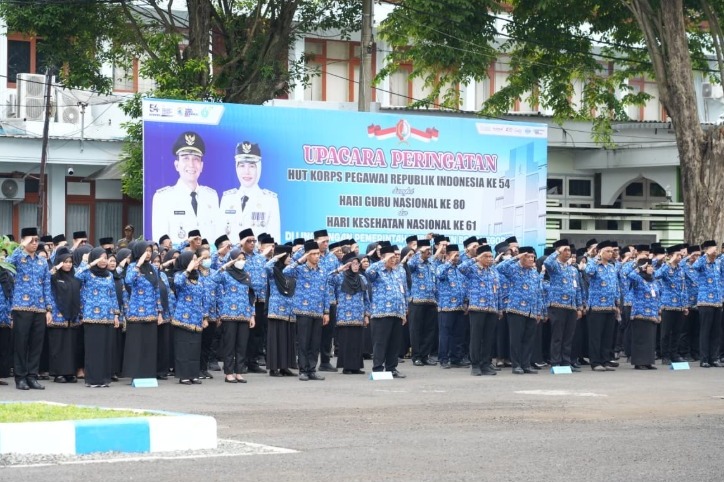 BOJONEGORO, dutaperistiwa.com – Pemerintah Kabupaten Bojonegoro menggelar upacara peringatan tiga hari besar nasional sekaligus, yakni Hari Ulang Tahun (HUT) Korps Pegawai Republik Indonesia (KORPRI) ke-54, Hari Guru Nasional (HGN) ke-80, dan Hari Kesehatan Nasional (HKN) ke-61 yang dilaksanakan di halaman Gedung Putih Pemkab Bojonegoro