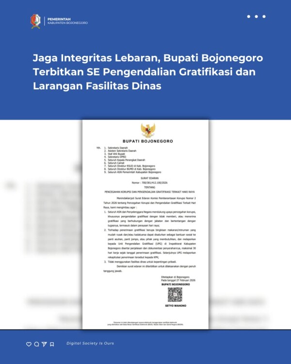 Langkah ini merupakan tindak lanjut langsung atas Surat Edaran Komisi Pemberantasan Korupsi (KPK) RI Nomor 2 Tahun 2026. Melalui SE tersebut, Bupati menekankan tiga poin krusial bagi seluruh jajaran Aparatur Sipil Negara (ASN) dan Penyelenggara Negara di lingkup Pemkab Bojonegoro: