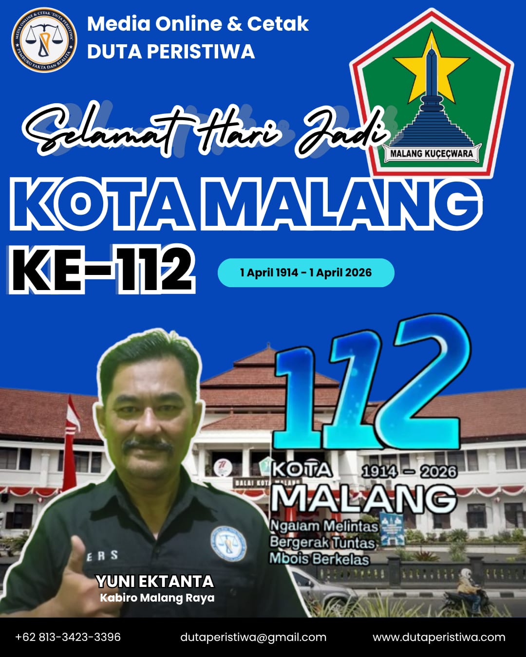 MALANG, dutaperistiwa.com – Peringatan Hari Jadi ke-112 Kota Malang yang jatuh pada 1 April 2026 menjadi momentum refleksi sekaligus penguatan semangat pembangunan bagi seluruh elemen masyarakat. Mengusung tema “Ngalam Melintas, Bergerak Tuntas, Mbois Berkelas”, perayaan tahun ini diharapkan mampu mendorong kemajuan Kota Malang yang semakin inklusif dan berdaya saing.