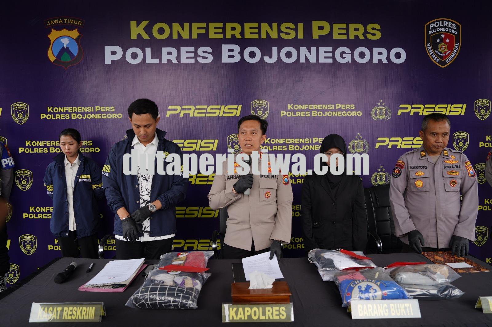 Kapolres Bojonegoro AKBP Afrian Satya Permadi menyampaikan langsung hasil ungkap kasus tersebut dalam konferensi pers yang digelar di lobi Mapolres Bojonegoro, Rabu (15/4/2026). Ia didampingi Kasat Reskrim AKP Cipto Dwi Leksana dan Kasi Humas AKP Karyoto.