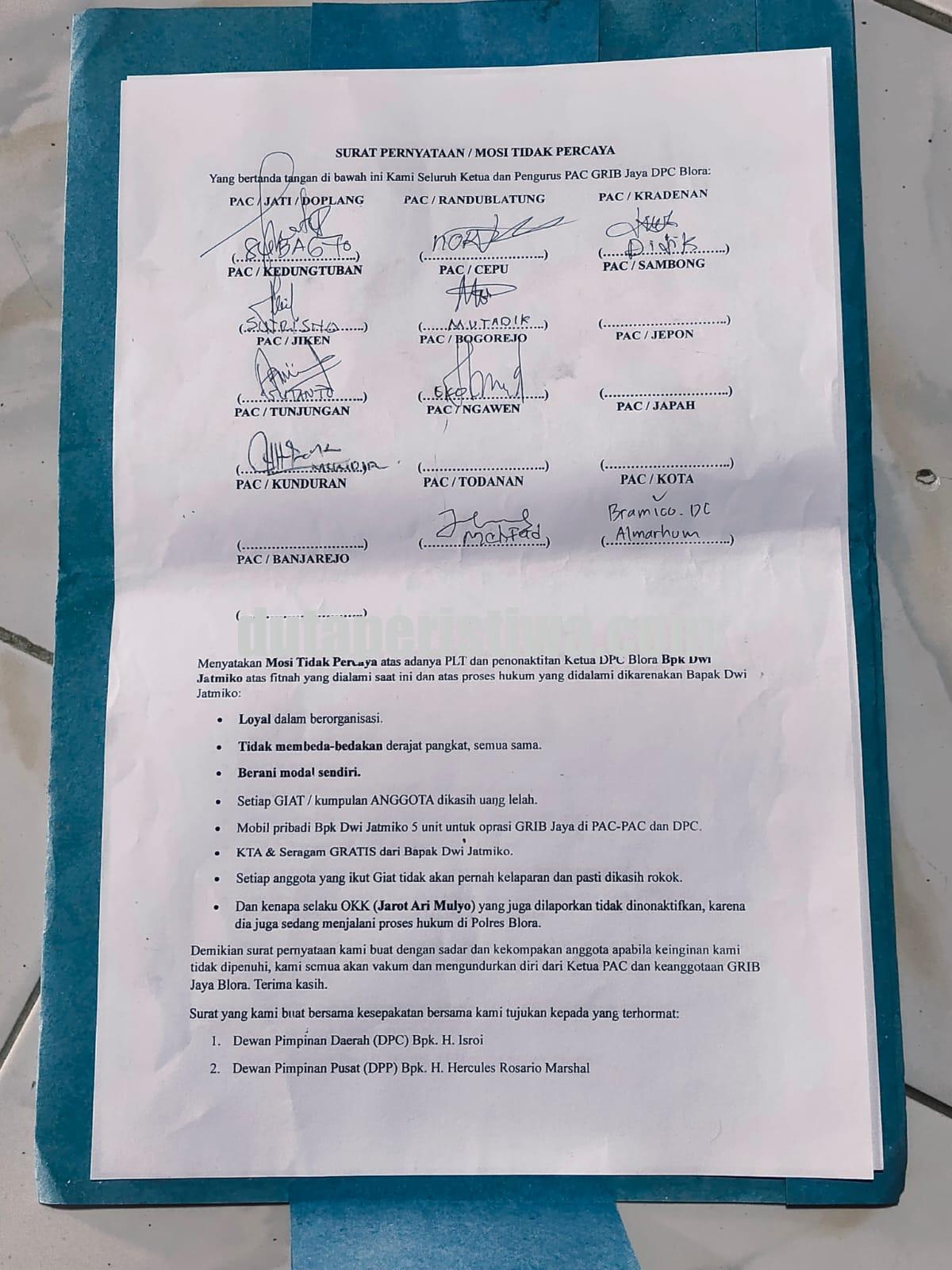 BLORA, dutaperistiwa.com – Dinamika internal organisasi GRIB Jaya di Kabupaten Blora kembali memanas. Sejumlah Ketua Pimpinan Anak Cabang (PAC) secara terbuka menyatakan mosi tidak percaya terhadap penunjukan Pelaksana Tugas (Plt) Ketua DPC GRIB Jaya Blora.