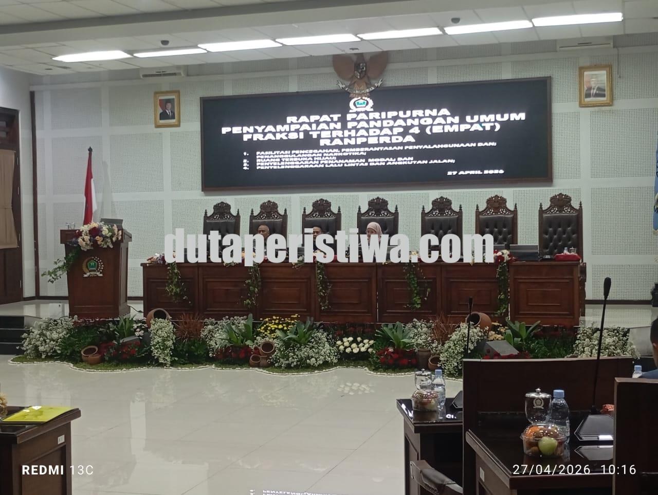 MALANG, dutaperistiwa.com – Dewan Perwakilan Rakyat Daerah (DPRD) Kota Malang menggelar Rapat Paripurna dengan agenda penyampaian pandangan umum fraksi terhadap empat Rancangan Peraturan Daerah (Ranperda), Senin (27/4/2026).